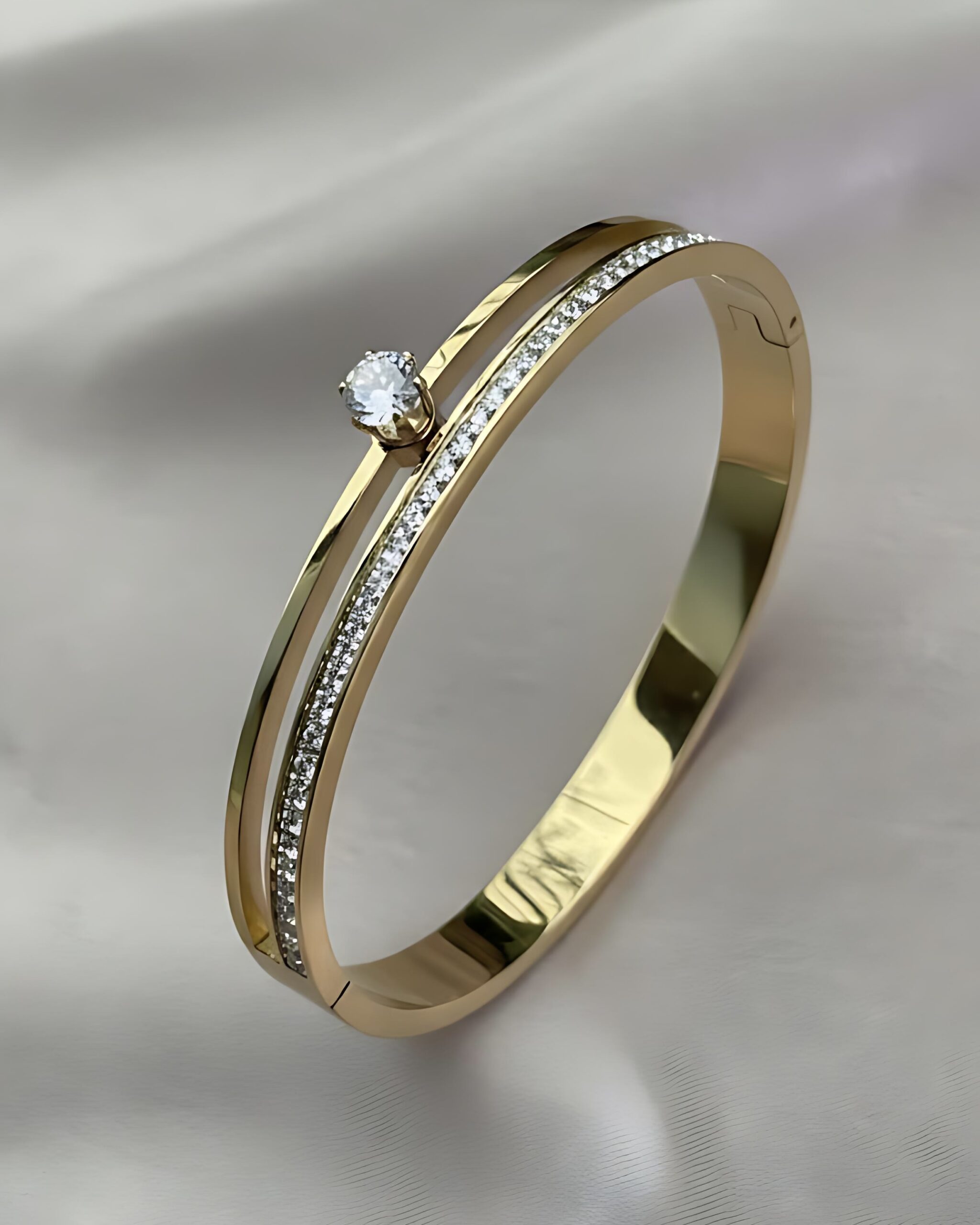 The focal point is the brilliant Central Solitaire Crystal, which sits elevated above the pave band, adding exceptional sparkle and depth. The bangle is secured with a discrete and convenient Hinged Clasp, ensuring an effortless fit and comfortable wear. Finished in a high-shine Gold Plating, this piece effortlessly channels High-End Luxury and Glamour.