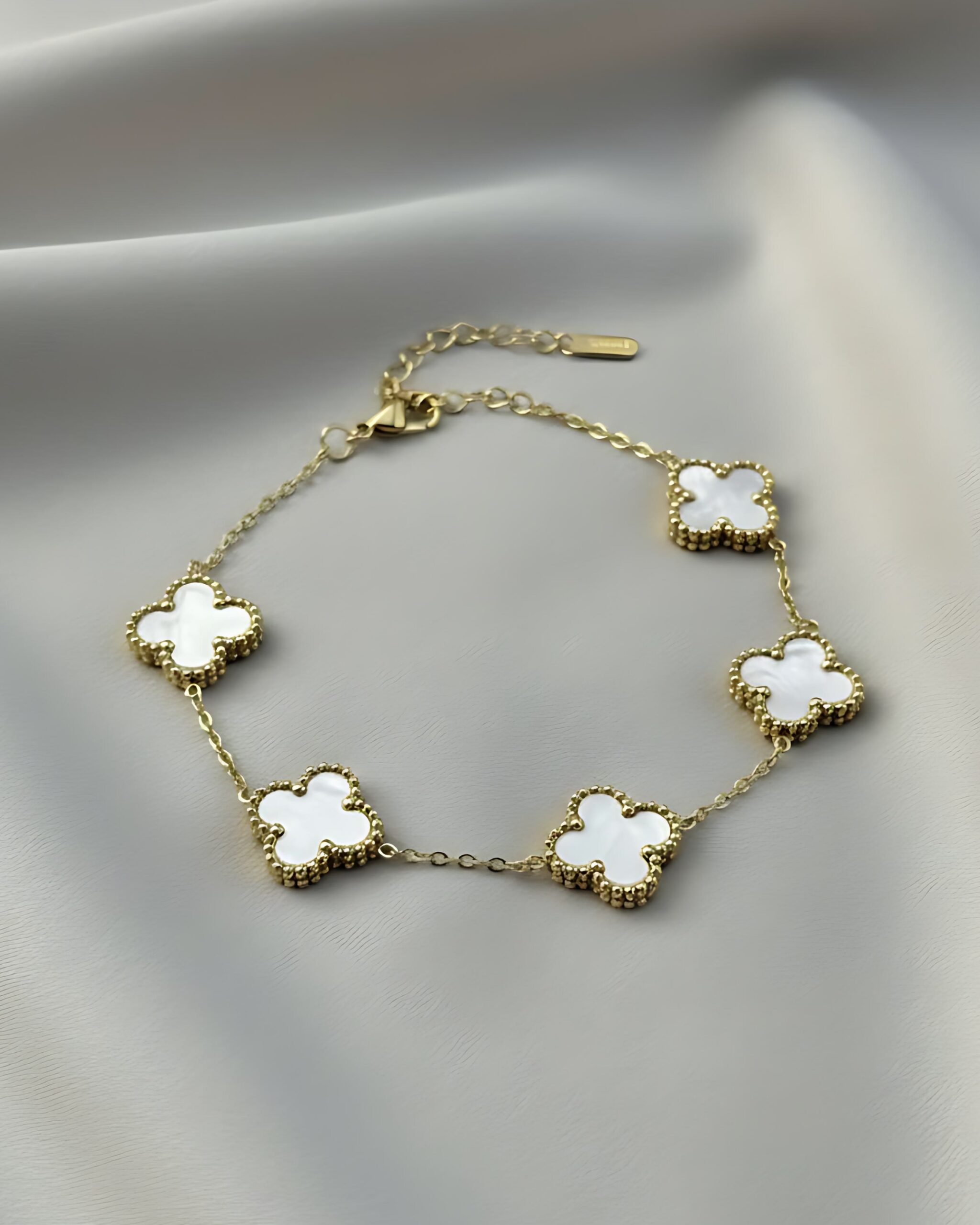 Adorn your wrist with the classic beauty of this Gold Mother-of-Pearl Clover Bracelet. This exquisite piece features a delicate Gold Link Chain that is interspersed with five charming Four-Leaf Clover motifs. Each clover is meticulously inlaid with radiant Mother-of-Pearl, which captures the light with a subtle, iridescent shimmer. The edges of the clovers are finished with fine Beaded Detailing, adding a touch of Opulent texture.